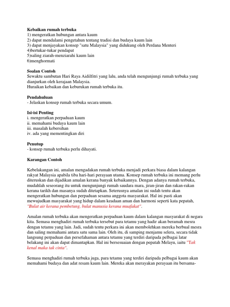 Contoh Karangan Fakta Pt3 Bahasa Melayu Pendek from mypt3.com Semasa menghadiri rumah terbuka selain kebaikan, terdapat juga keburukannya kerana rumah terbuka akan menimbulkan masalah untuk menjaga kebersihan di tempat rumah terbuka itu. Perkongsian soalan, nota, latihan, skema jawapan, bahan rujukan dan informasi terkini (tema) rumah terbuka atau 'open house' sudah menjadi lumrah pada sambutan perayaan di negara ini termasuk deepavali, tahun baru cina, hari natal dan juga hari raya aidilfitri. Kepentingan amalan tertentu dalam perayaan pelbagai kaum. Ramadhan di rumah, berikut niat dan tata cara melaksanakan shalat tarawih. Jadi, amalan ini baik dan wajar sekali diteruskan dari masa ke masa bagi menyemai perasaan muhibah dalam kalangan masyarakat. Semasa menghadiri rumah terbuka selain kebaikan, terdapat juga keburukannya kerana rumah terbuka akan menimbulkan masalah untuk menjaga kebersihan di tempat rumah terbuka itu. Apabila tiba sahaja musim perayaan seperti hari raya aidilfitri, deepavali, tahun baru cina dan hari krismas, masyarakat malaysia akan mengambil kesempatan untuk mengunjungi rumah terbuka yang. Sekiranya konsep ini tidak difahami dan dihayati, kemungkinan amalan ini akan mendatangkan keburukan atau sekadar syarat sahaja untuk menganjurkannya.